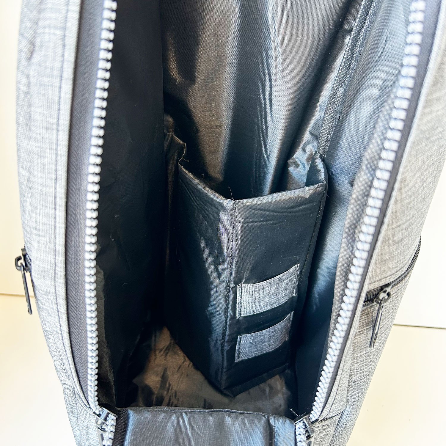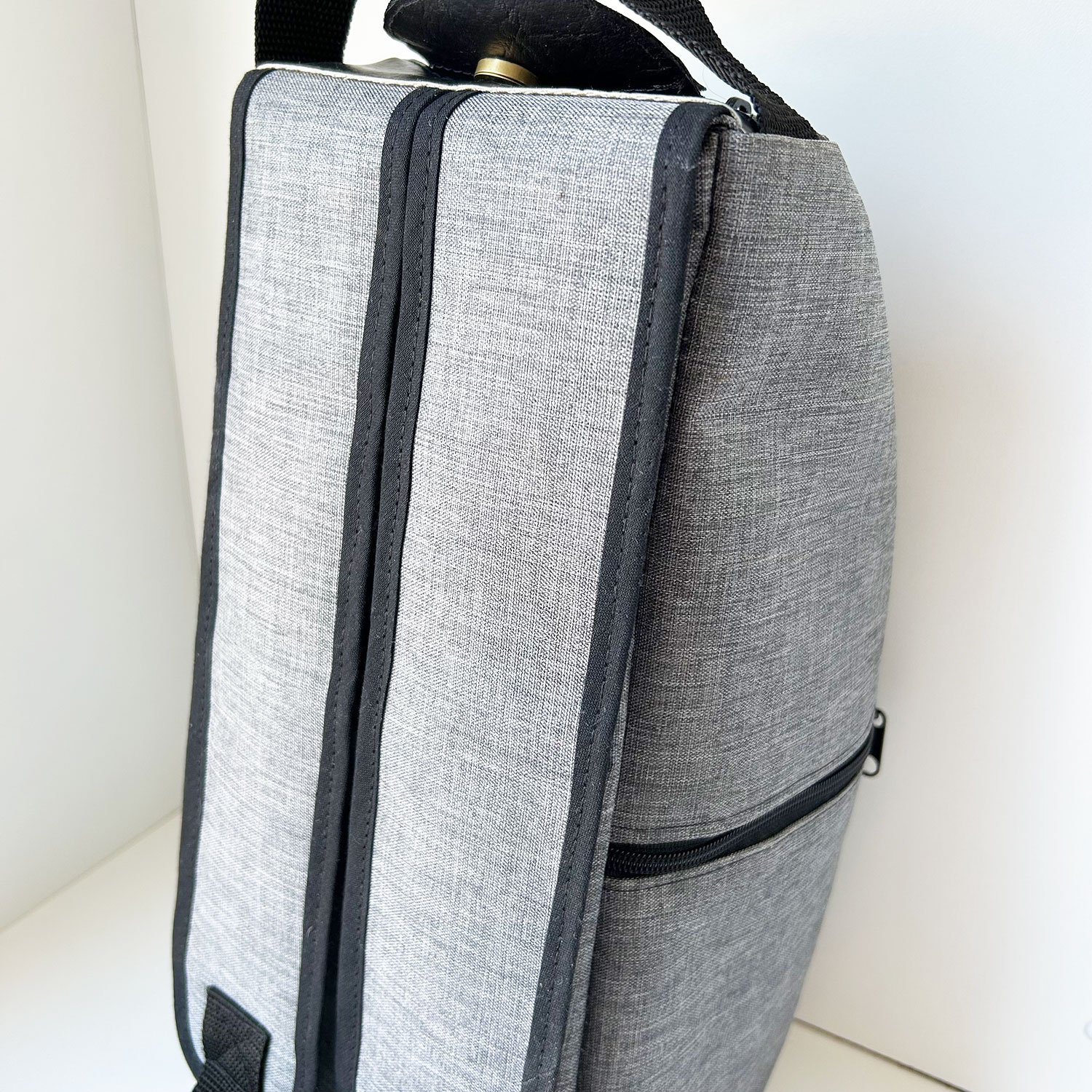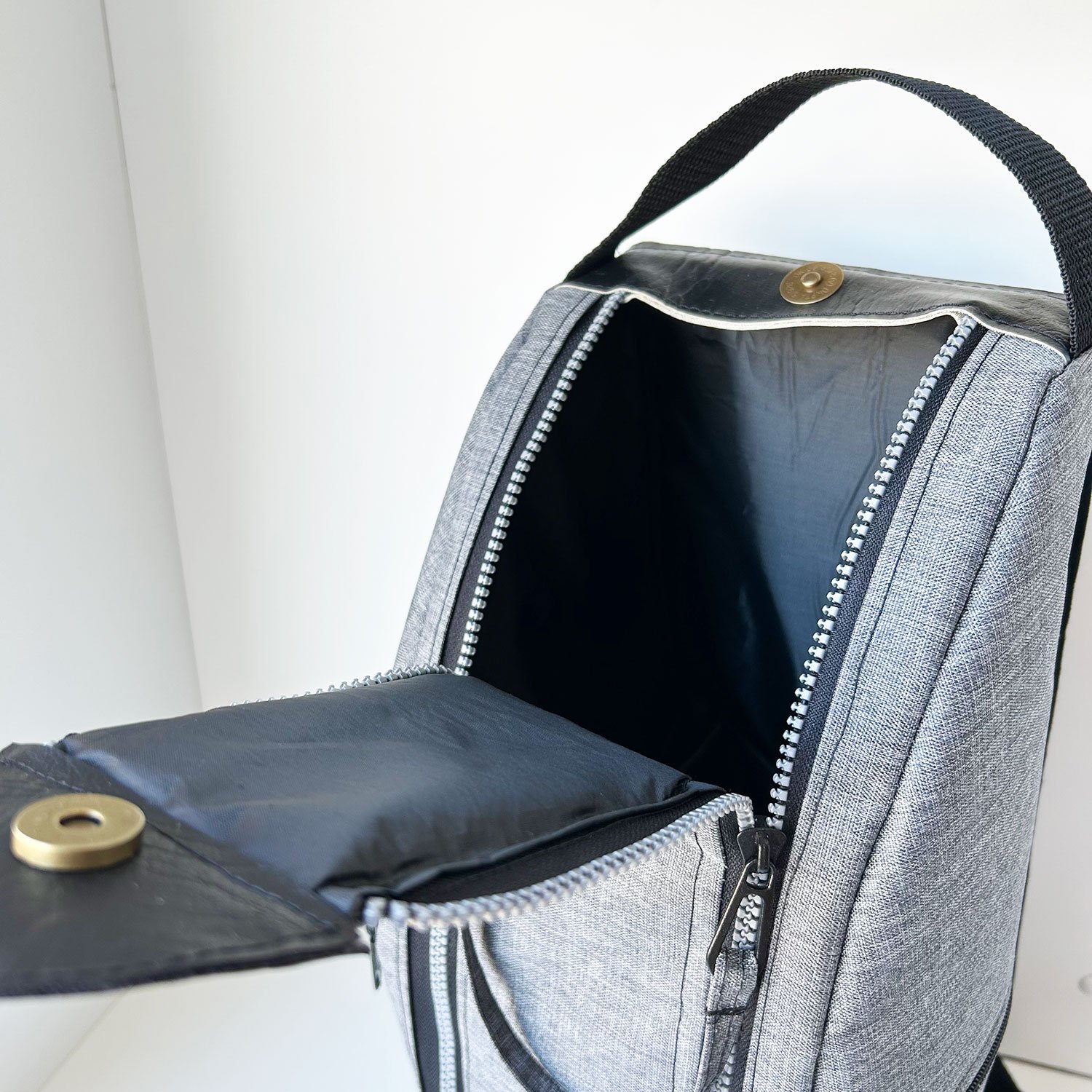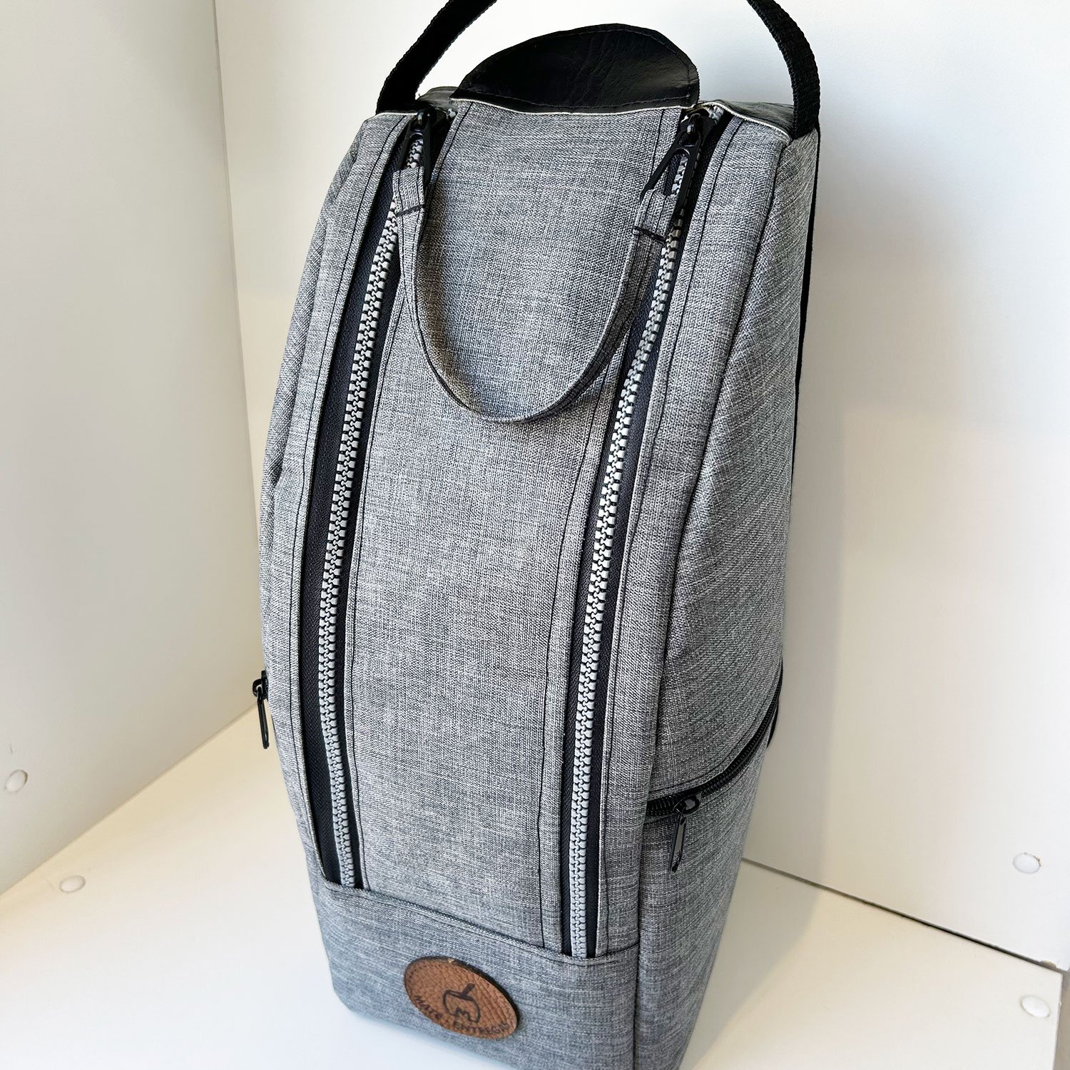 Botinero de cordura gris, cierre frontal con broche imantado, bolsillos laterales. 37 alto x 17 ancho. Yerbera y azucarera de cordura gris.