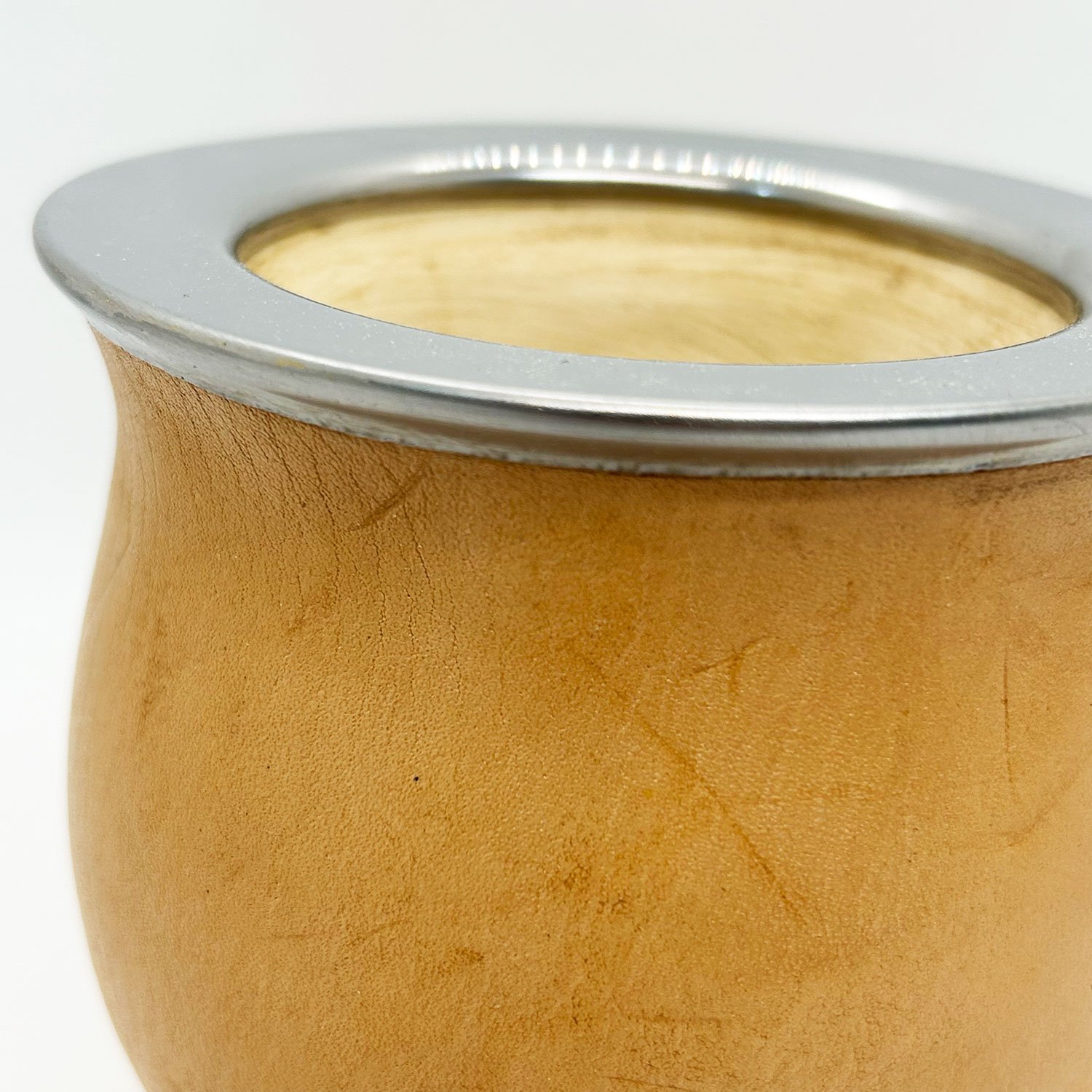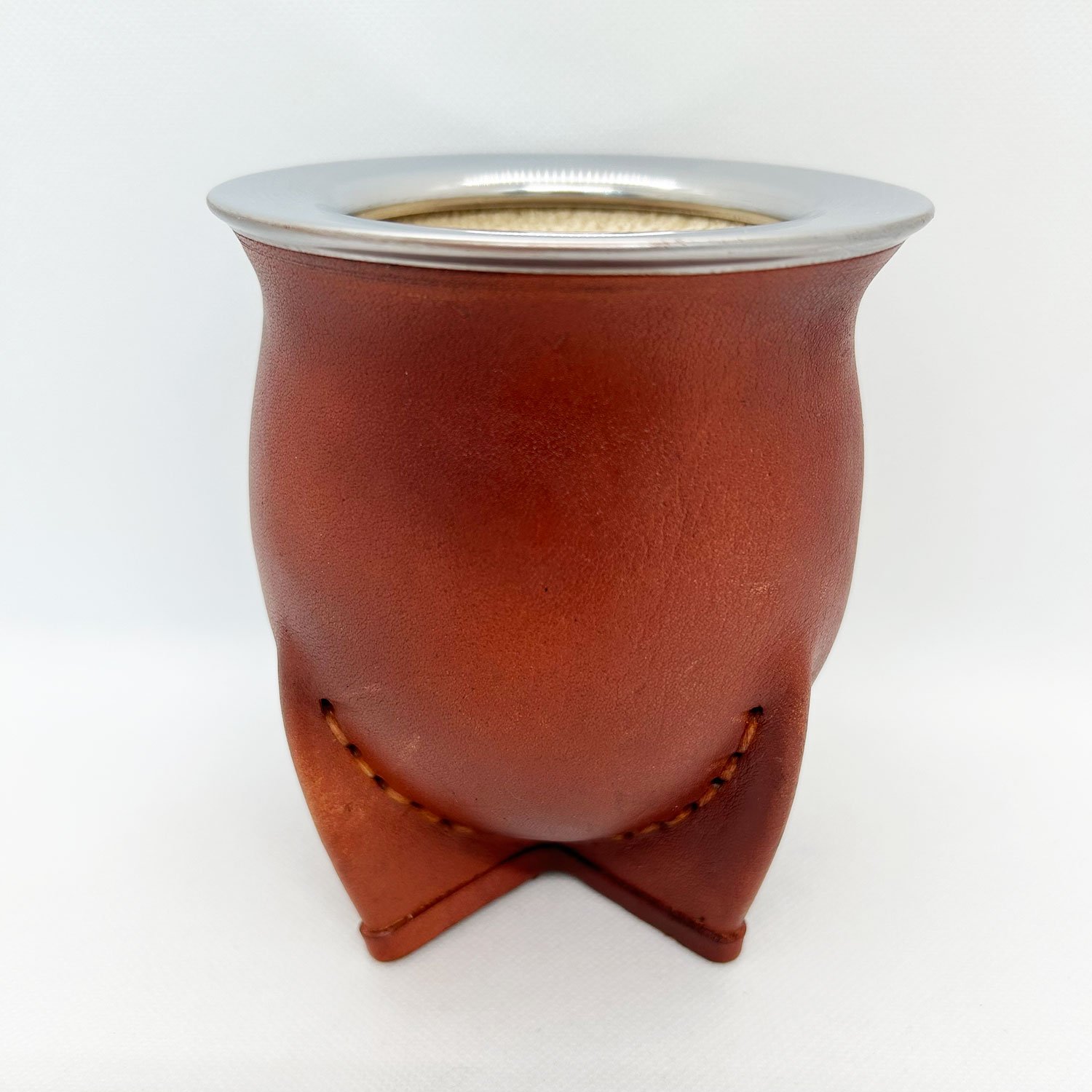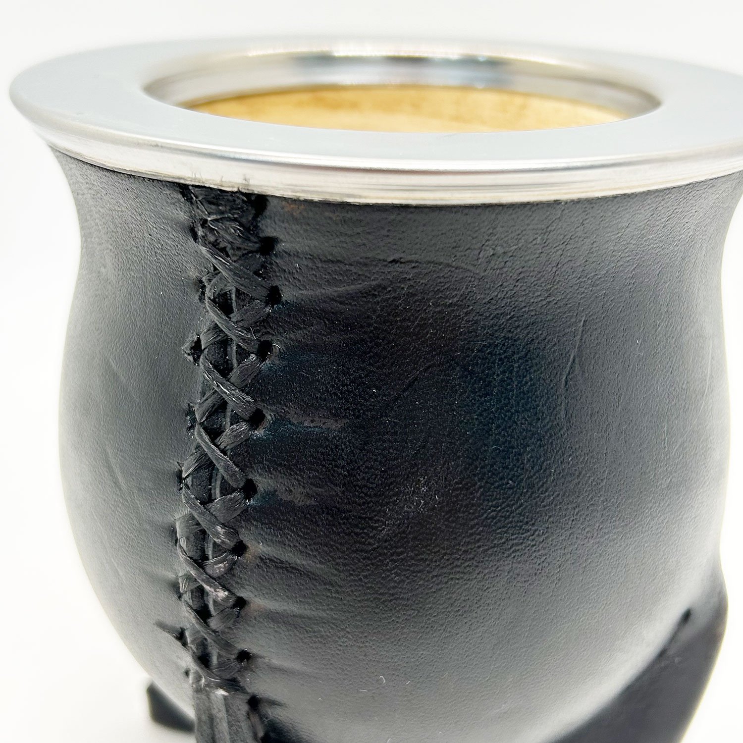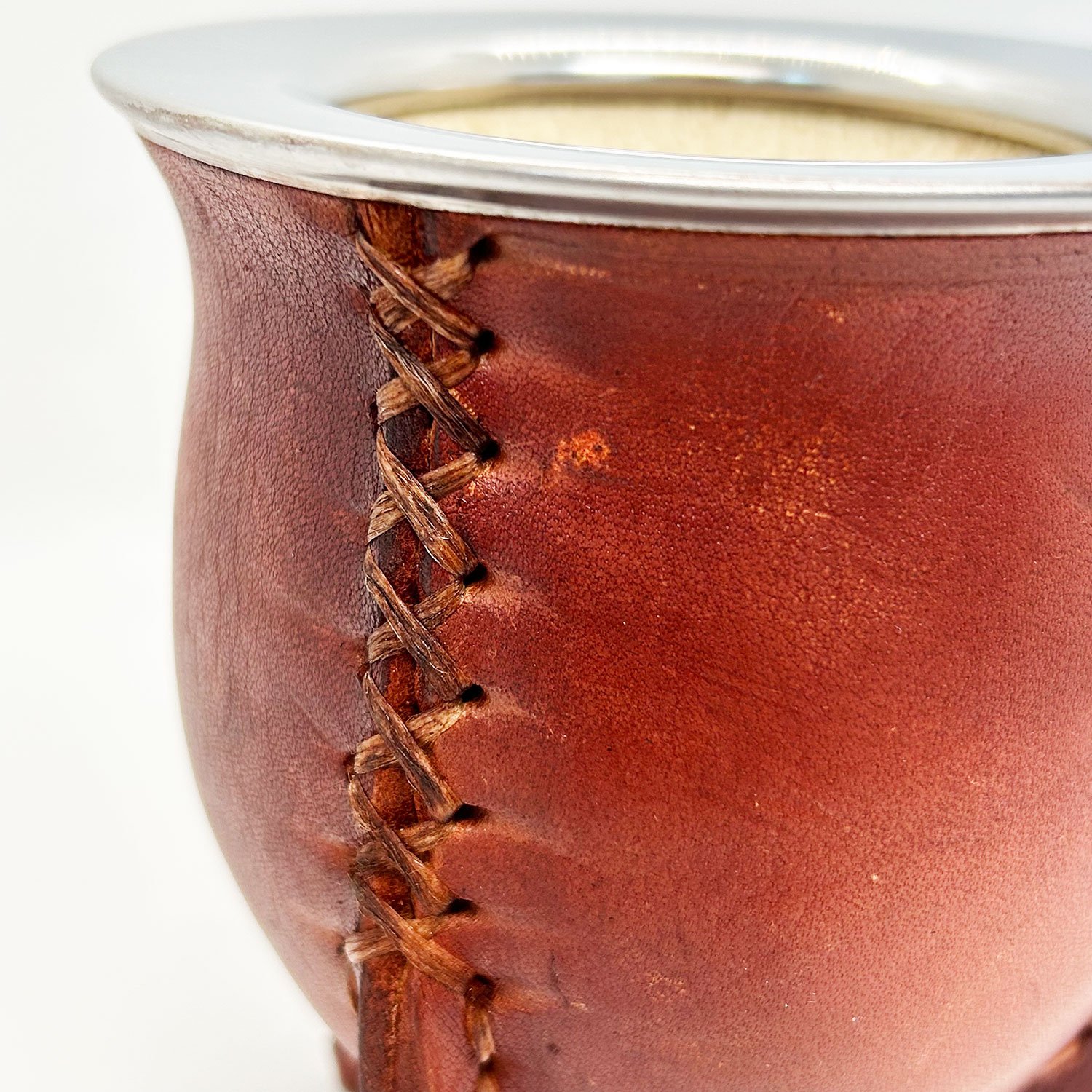 Calabaza gruesa, forrado en cuero legítimo, costura cruzada y virola de acero inoxidable.