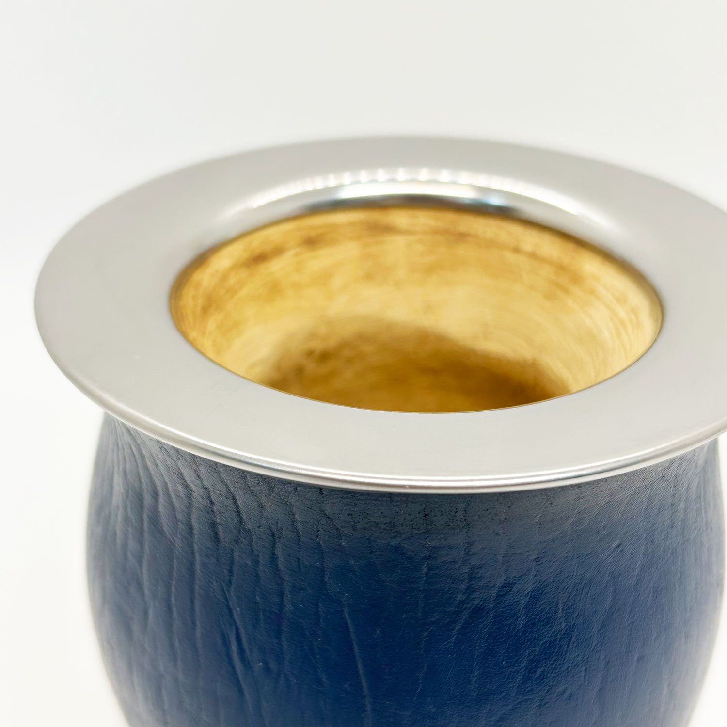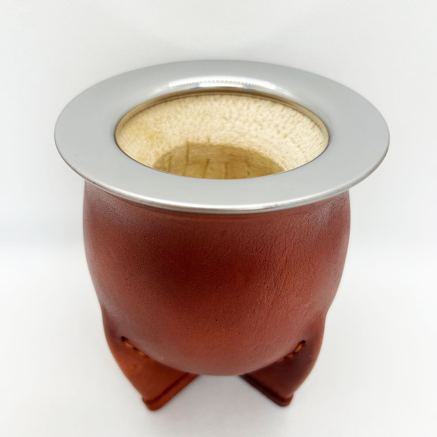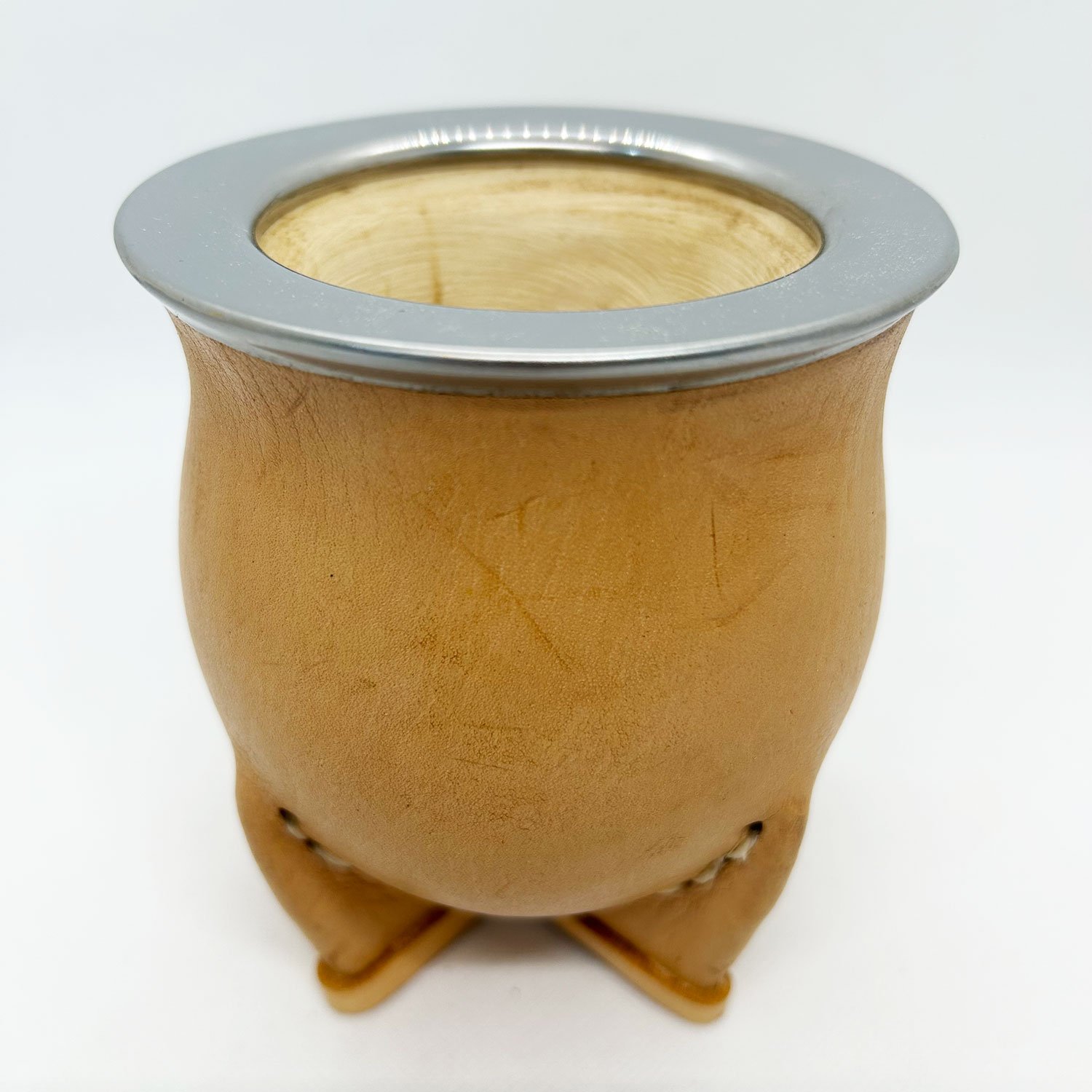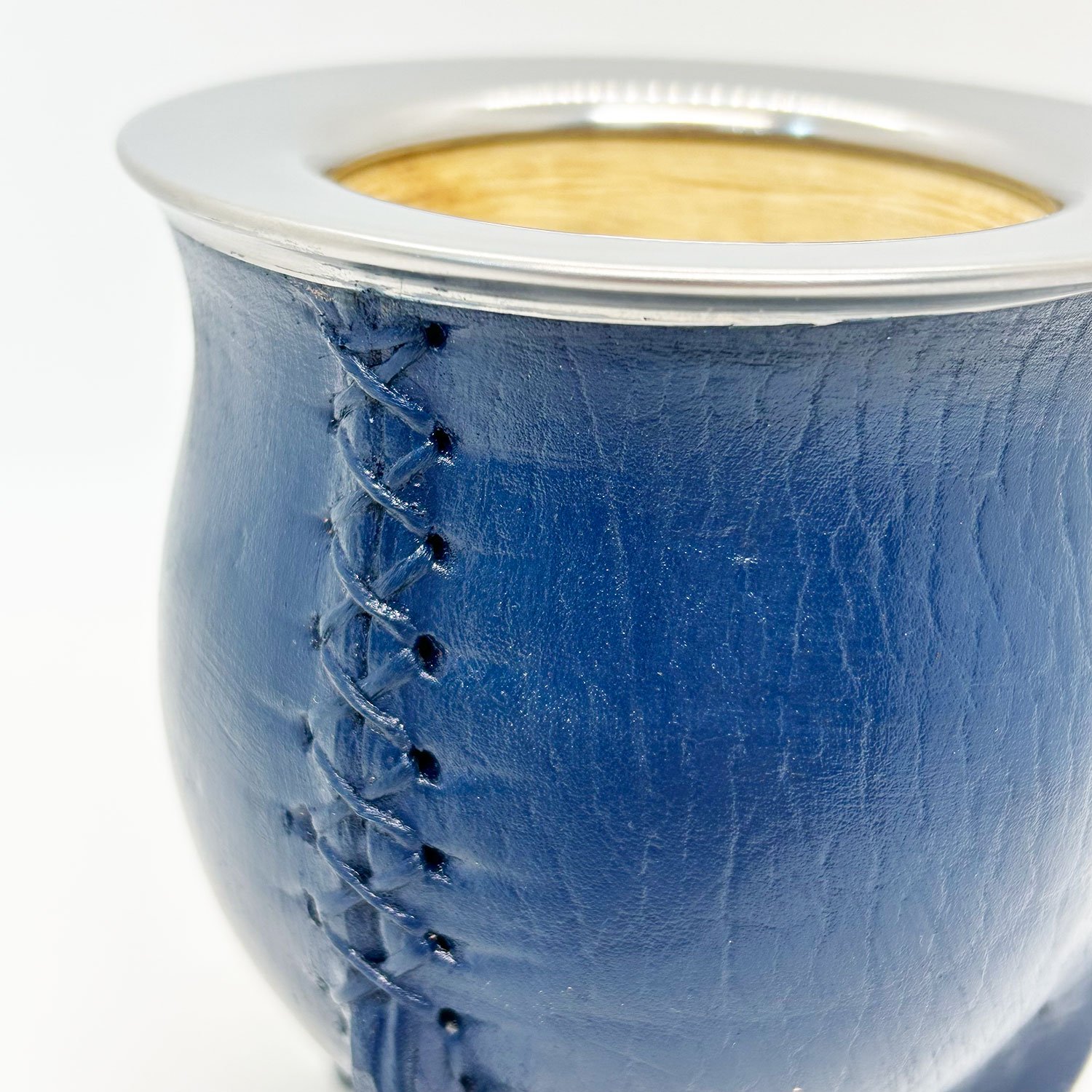 Calabaza gruesa, forrado en cuero legítimo, costura cruzada y virola de acero inoxidable.