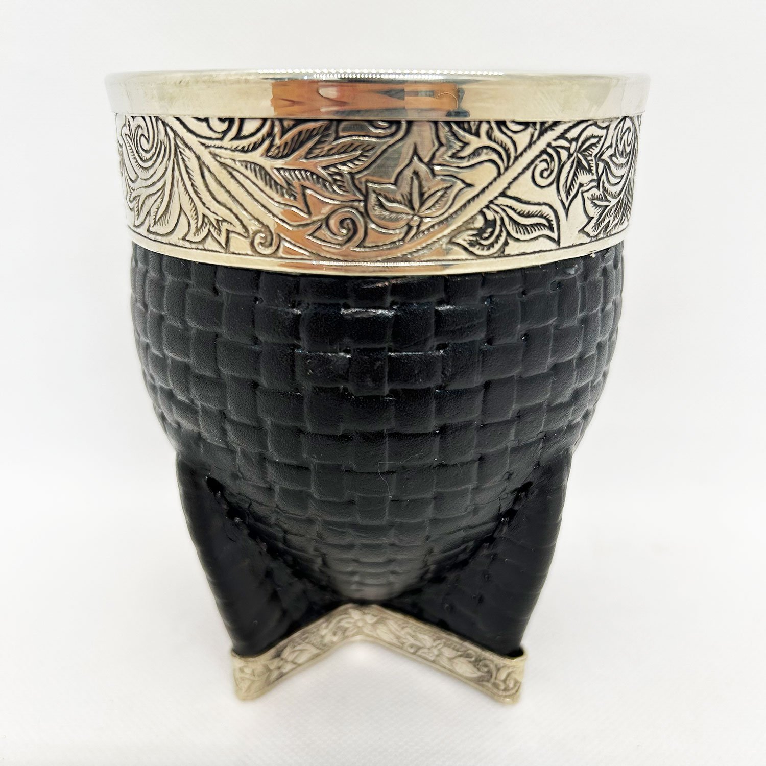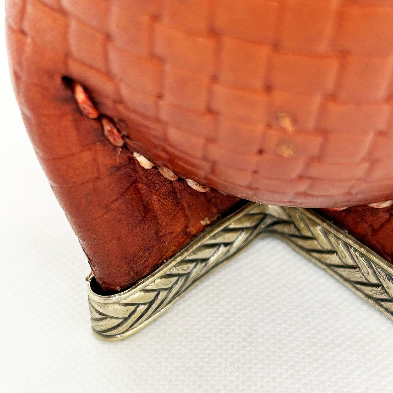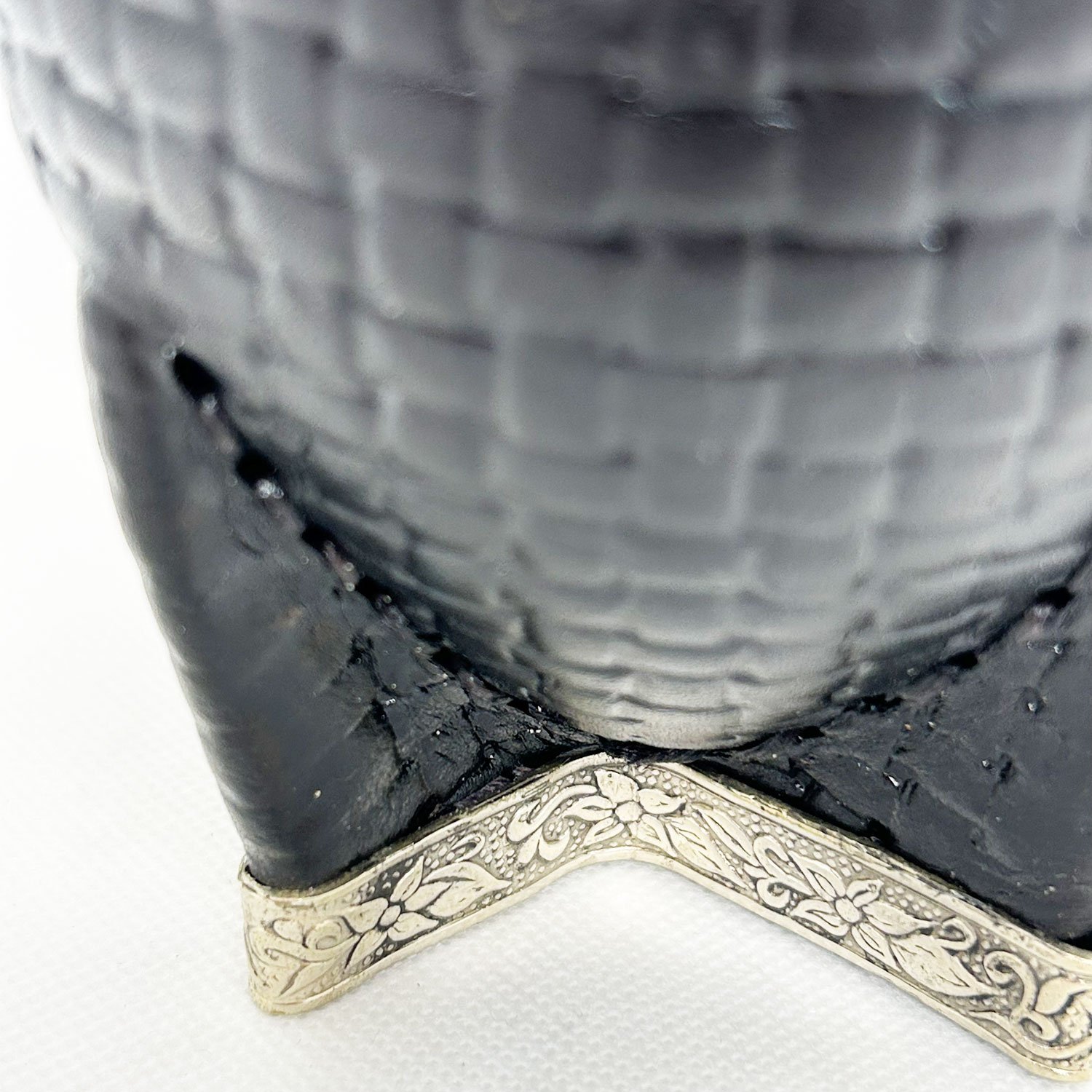 Calabaza gruesa, forrado en cuero legítimo croco, costura cruzada, virola de alpaca y refuerzo de alpaca.