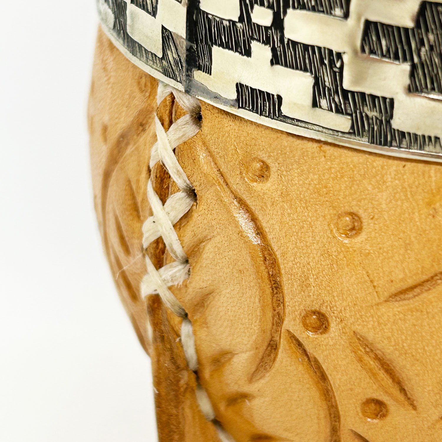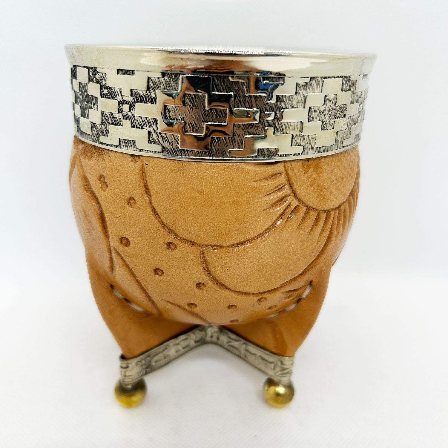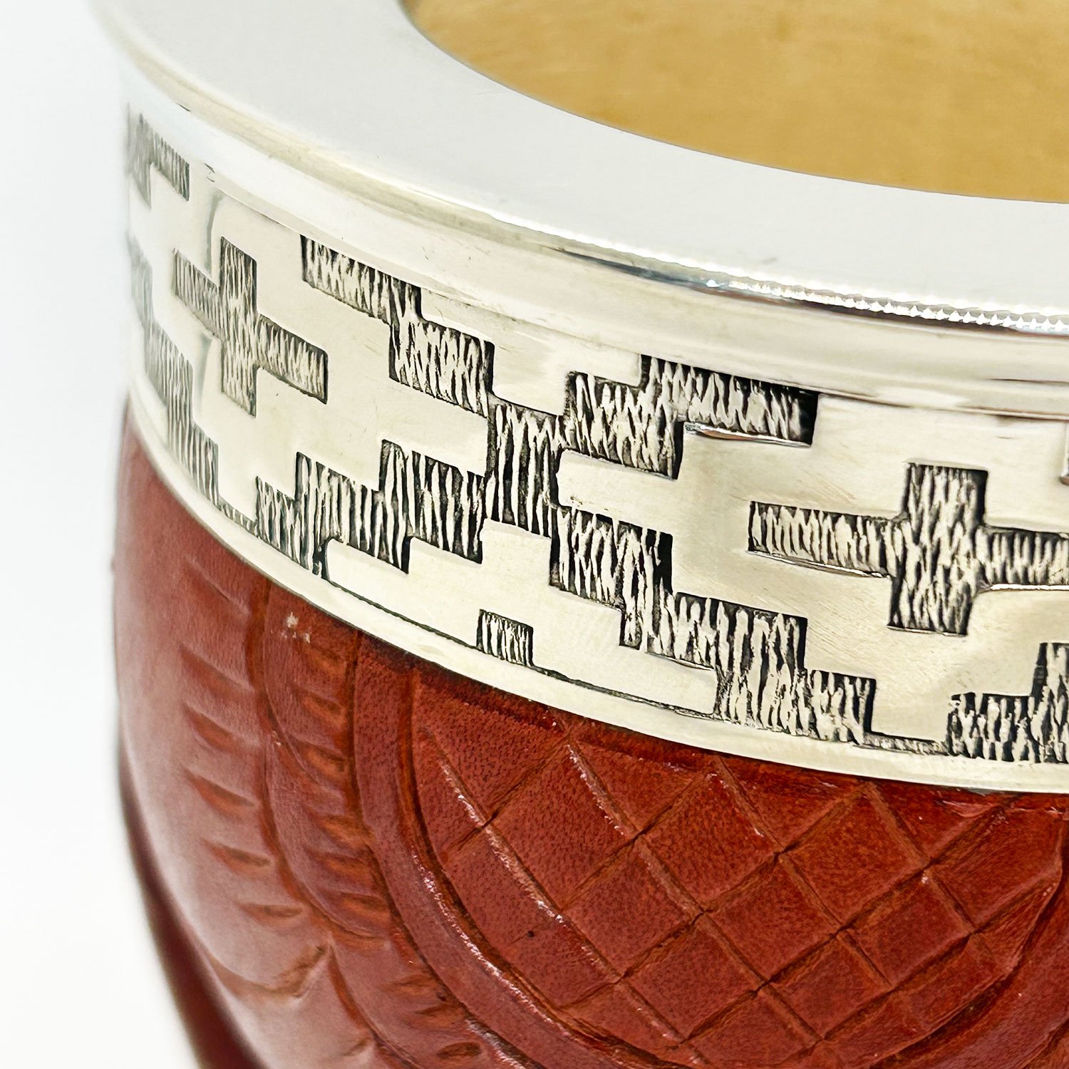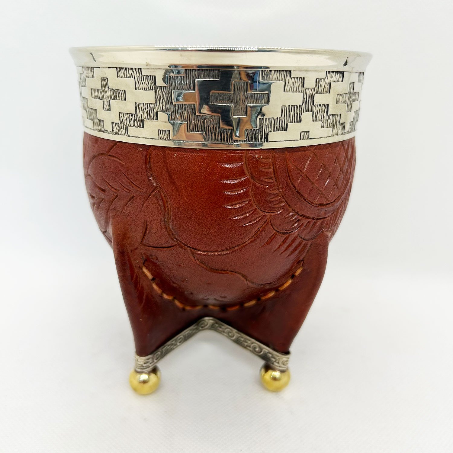 Calabaza gruesa, forrado en cuero legítimo labrado, costura cruzada, virola de alpaca con refuerzo de alpaca y bolitas de bronce.