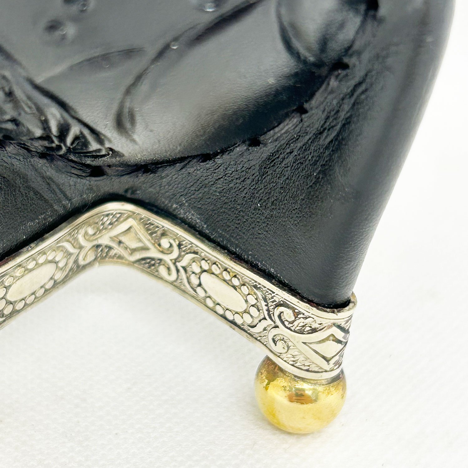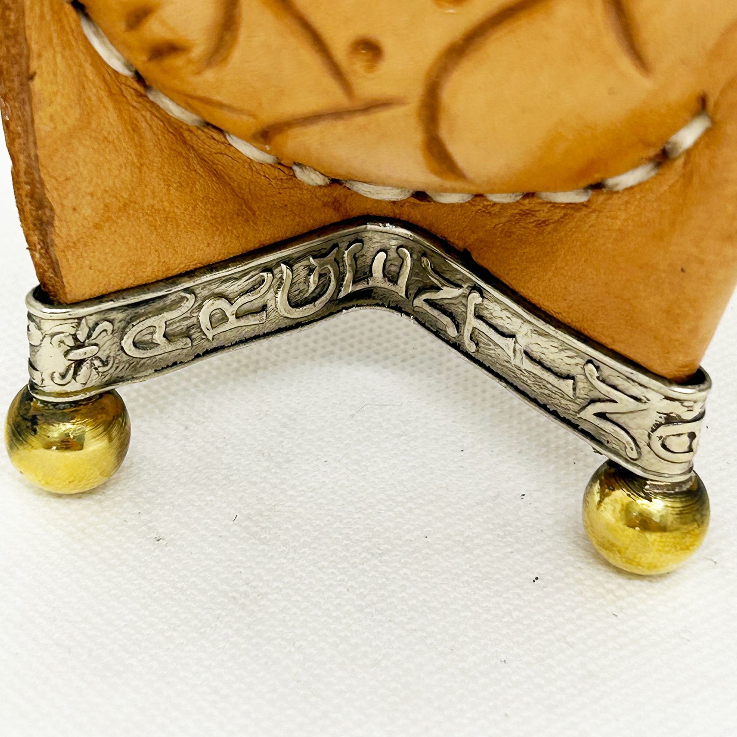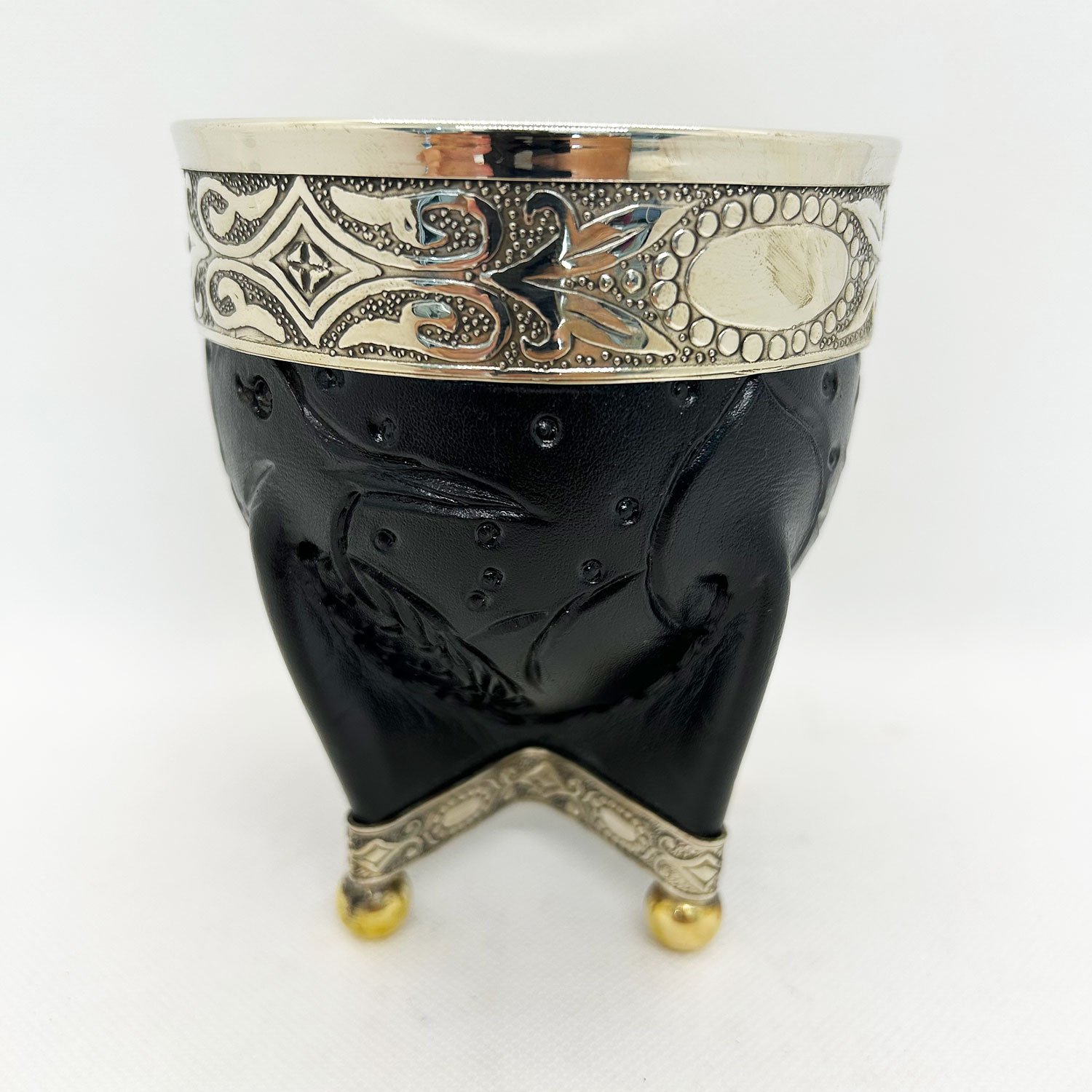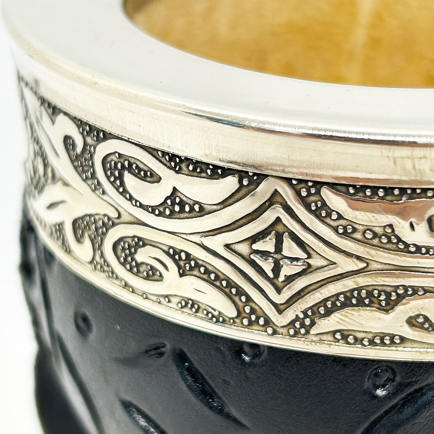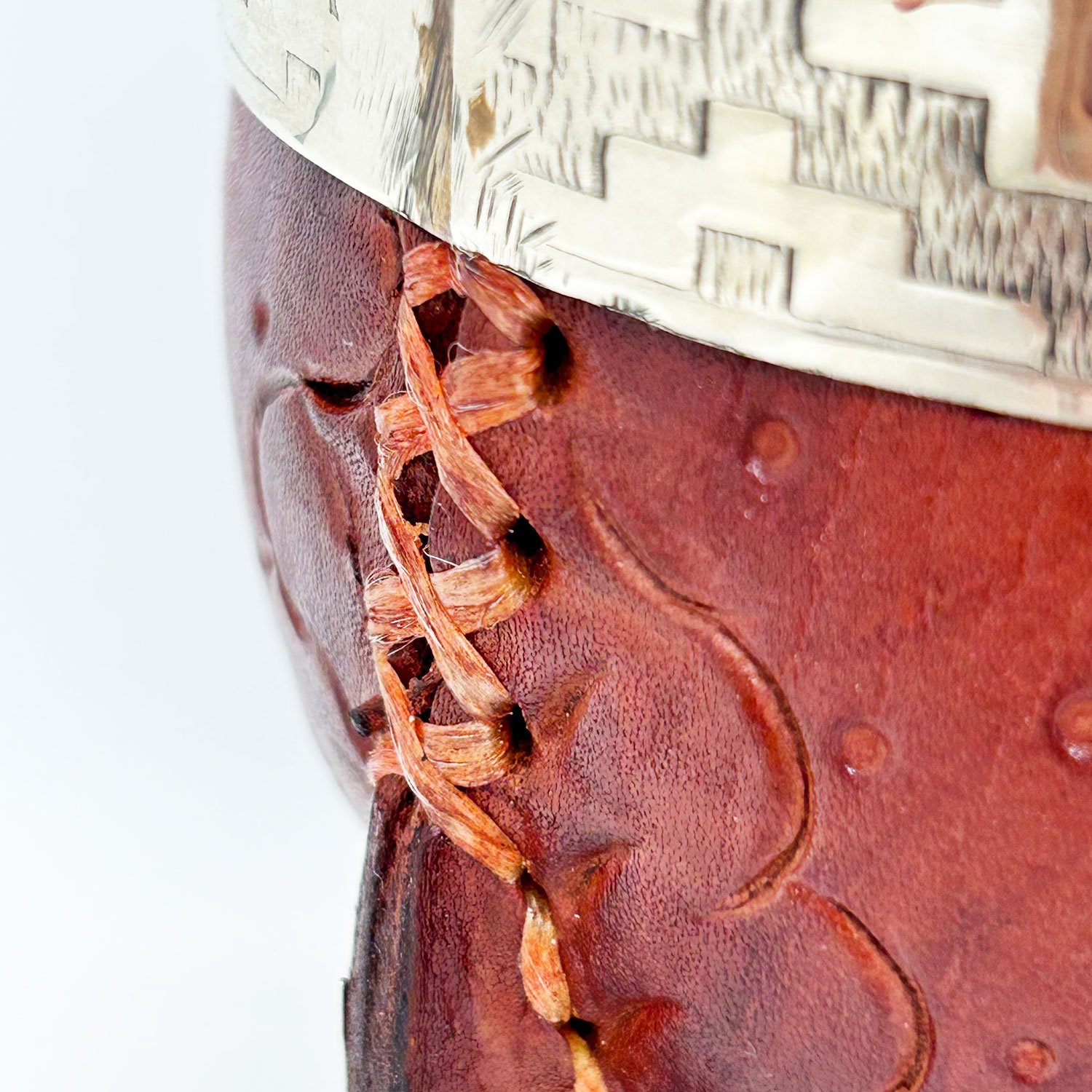 Calabaza gruesa, forrado en cuero legítimo labrado, costura cruzada, virola de alpaca con refuerzo de alpaca y bolitas de bronce.