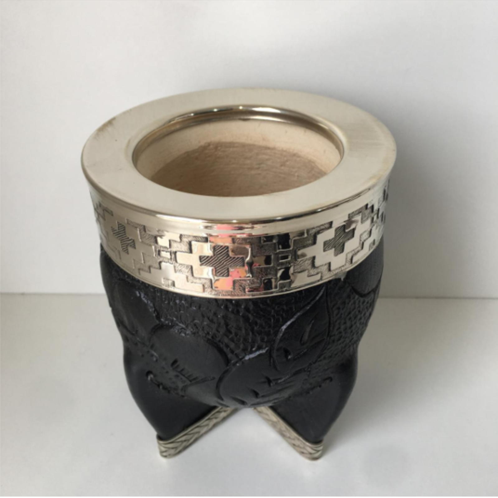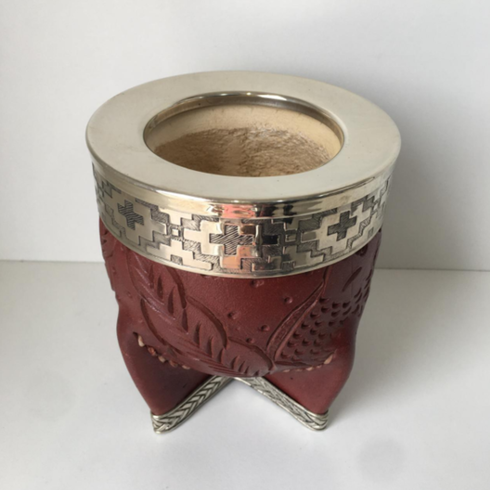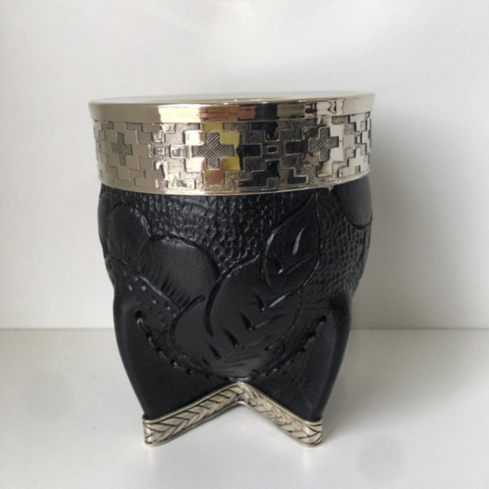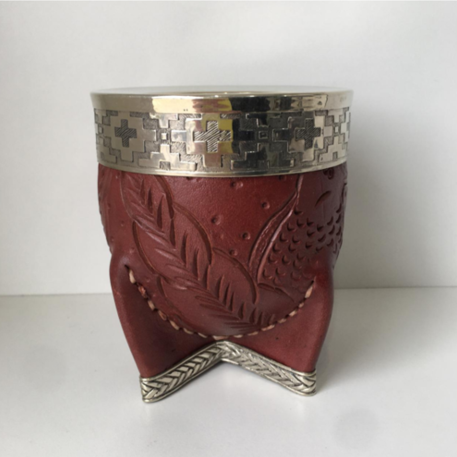 Calabaza gruesa, forrado en cuero legítimo labrado, costura cruzada y virola de alpaca con refuerzo alpaca.