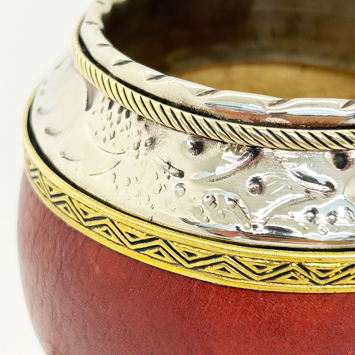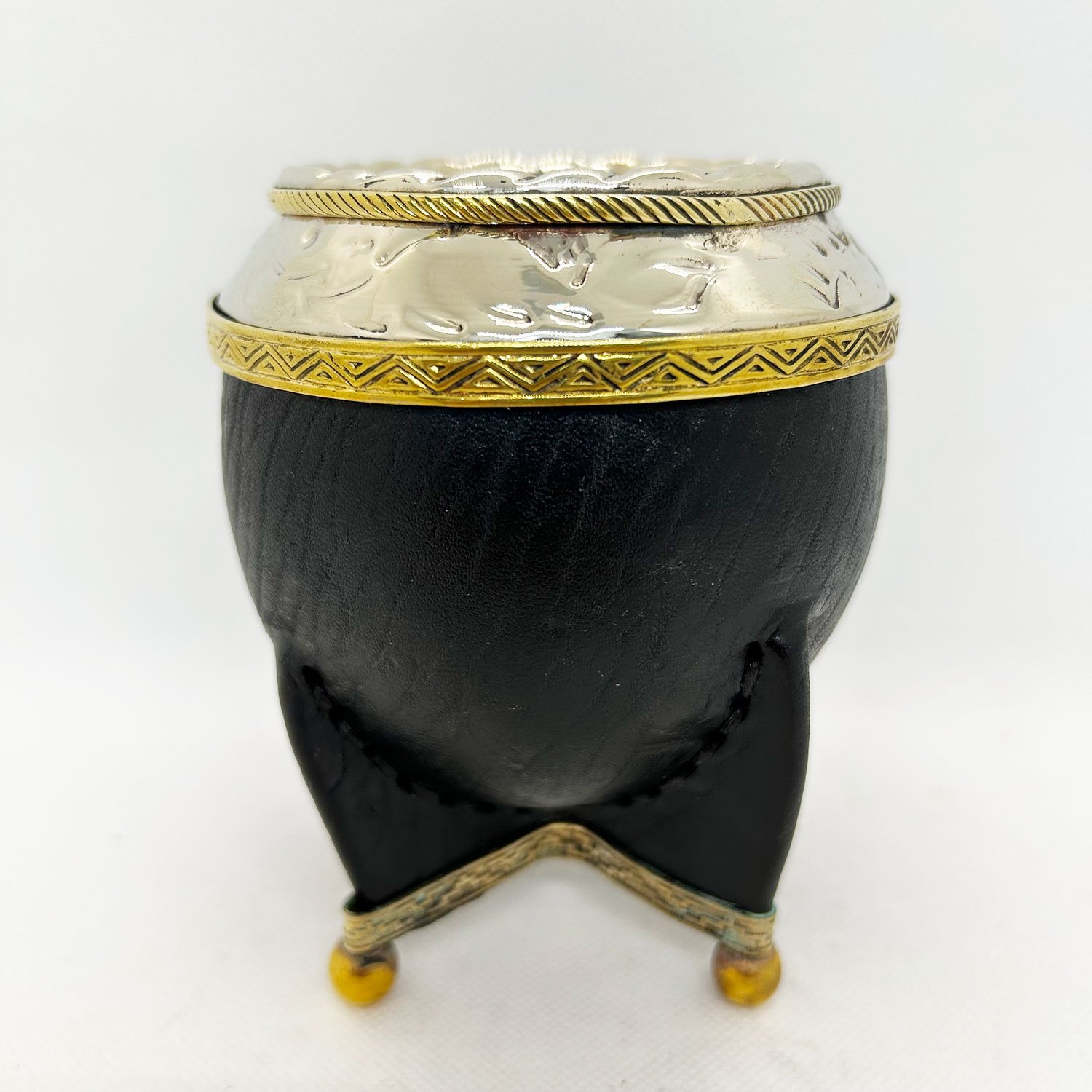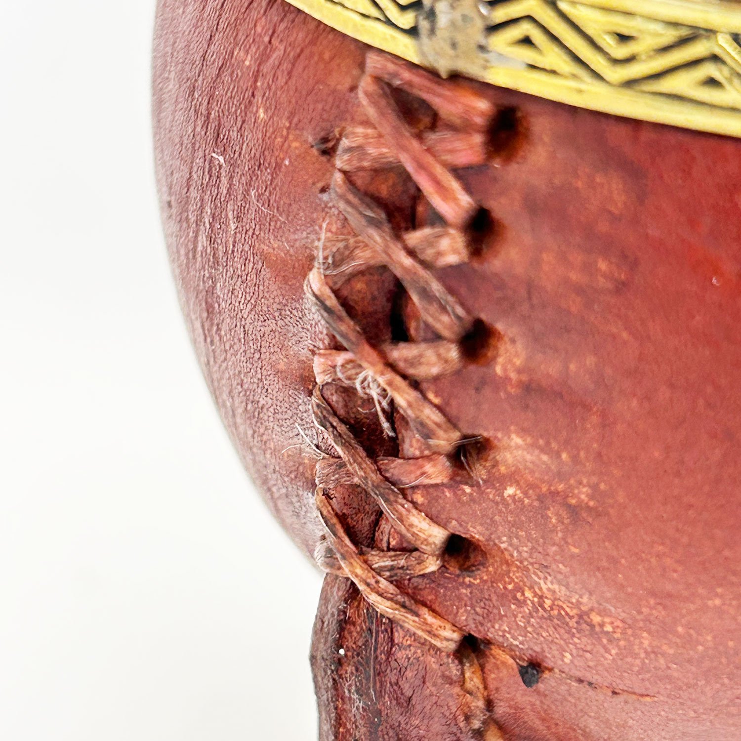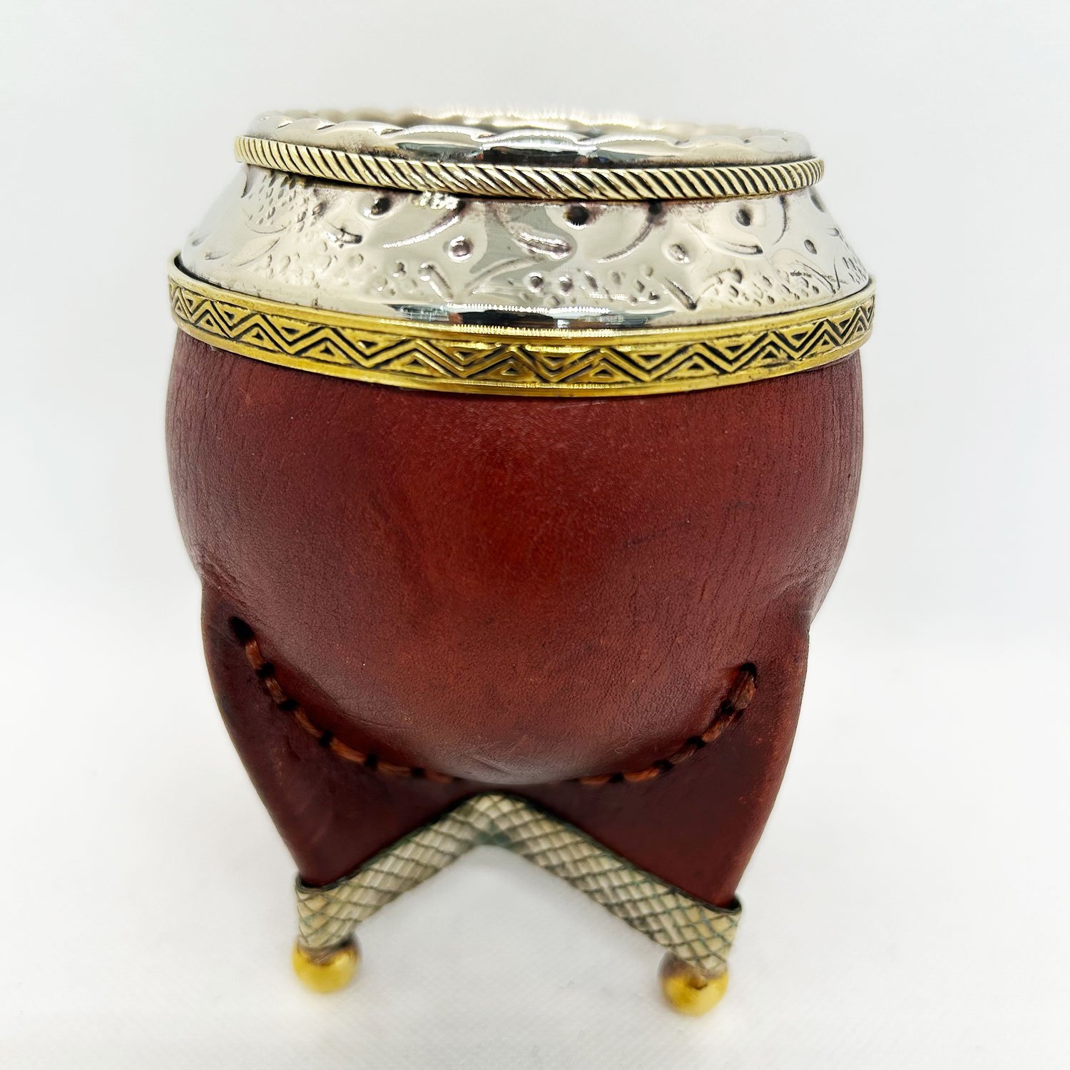 Calabaza gruesa, forrado en cuero legítimo, costura cruzada, virola de alpaca cincelada con corona de bronce + refuerzo de alpaca y bolitas de bronce.