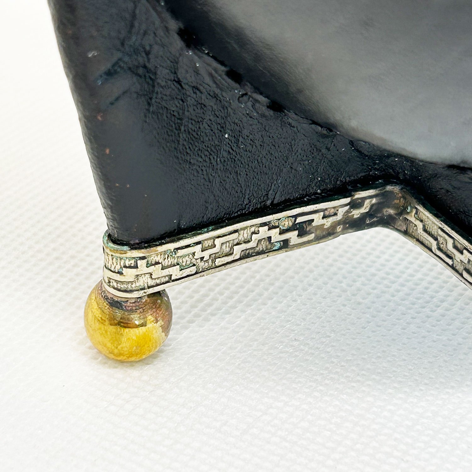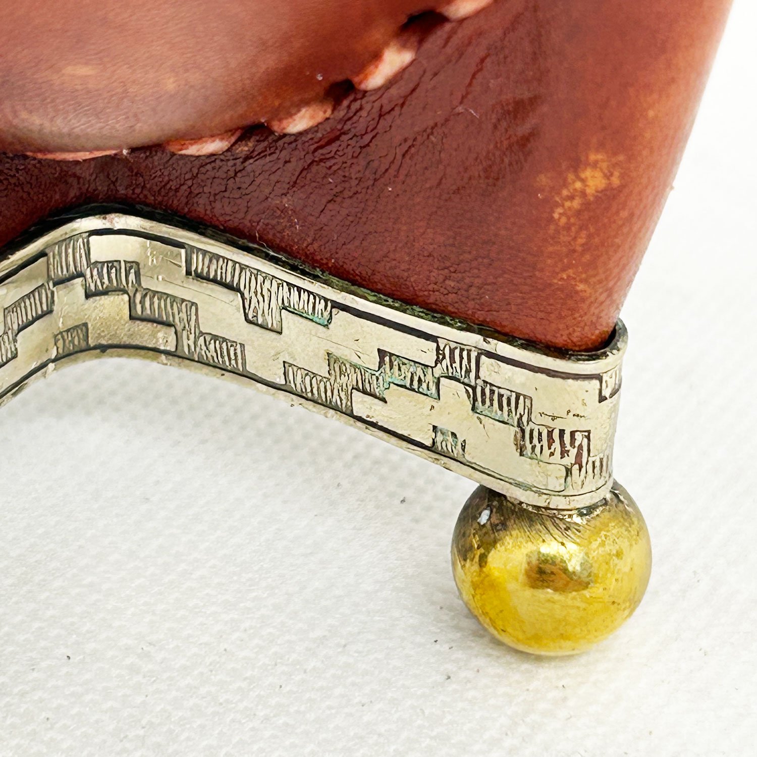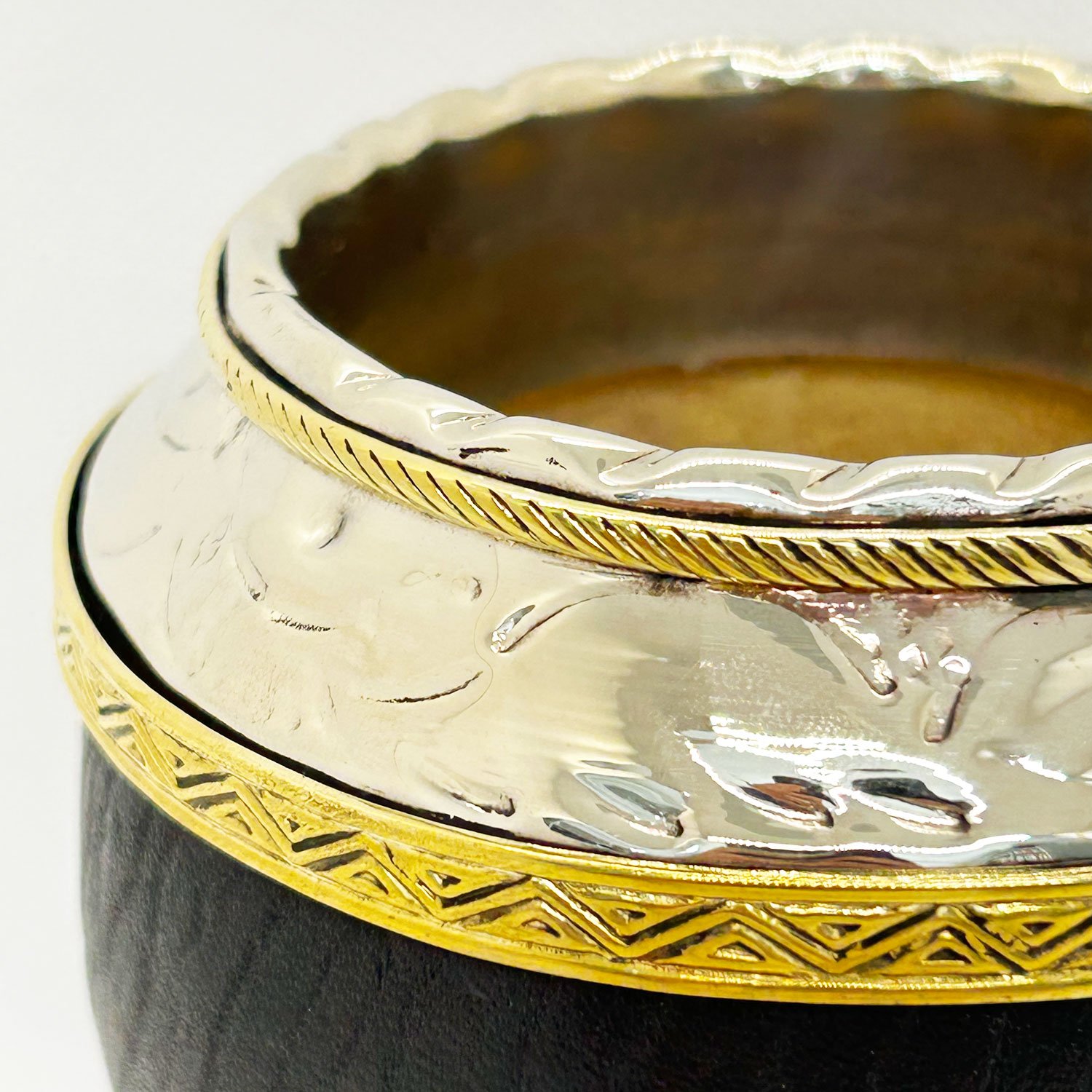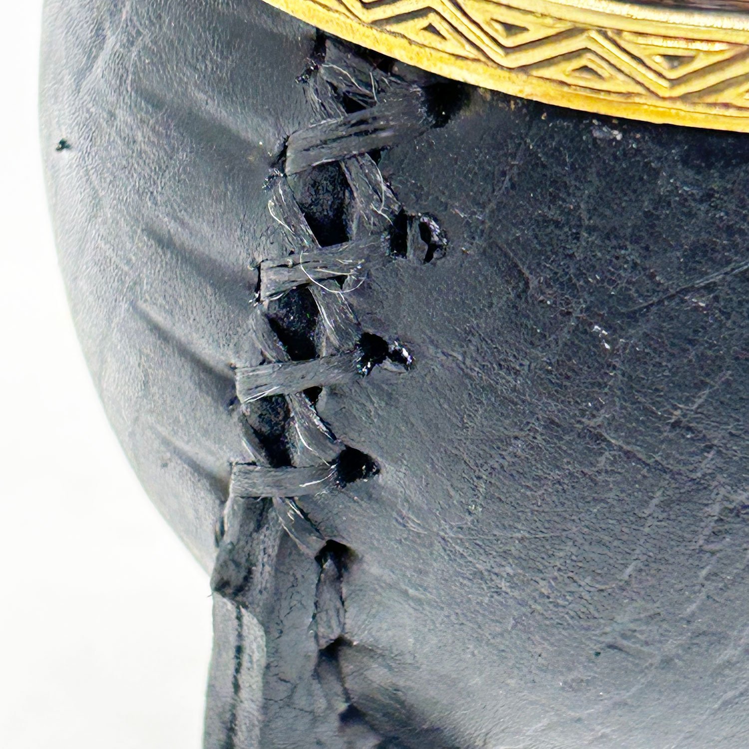 Calabaza gruesa, forrado en cuero legítimo, costura cruzada, virola de alpaca cincelada con corona de bronce + refuerzo de alpaca y bolitas de bronce.
