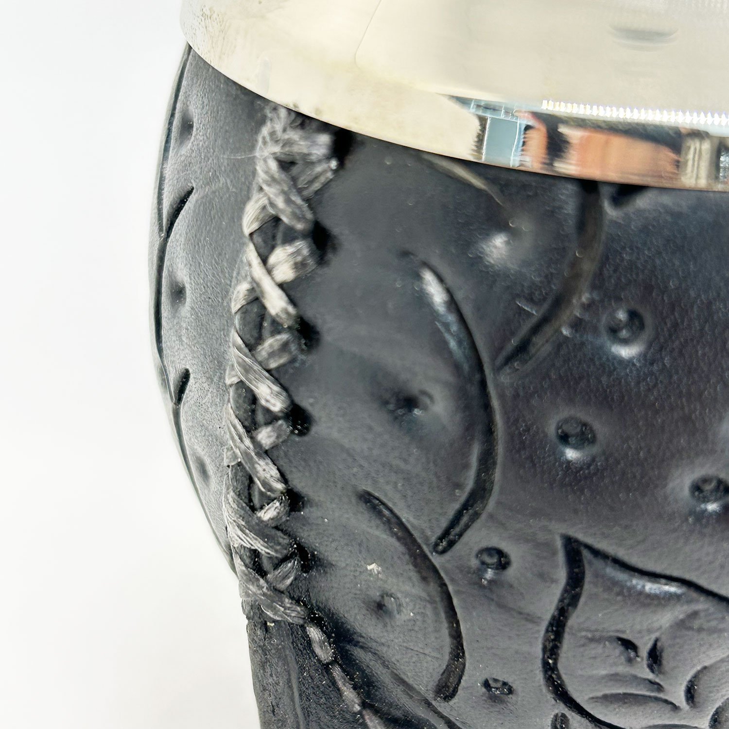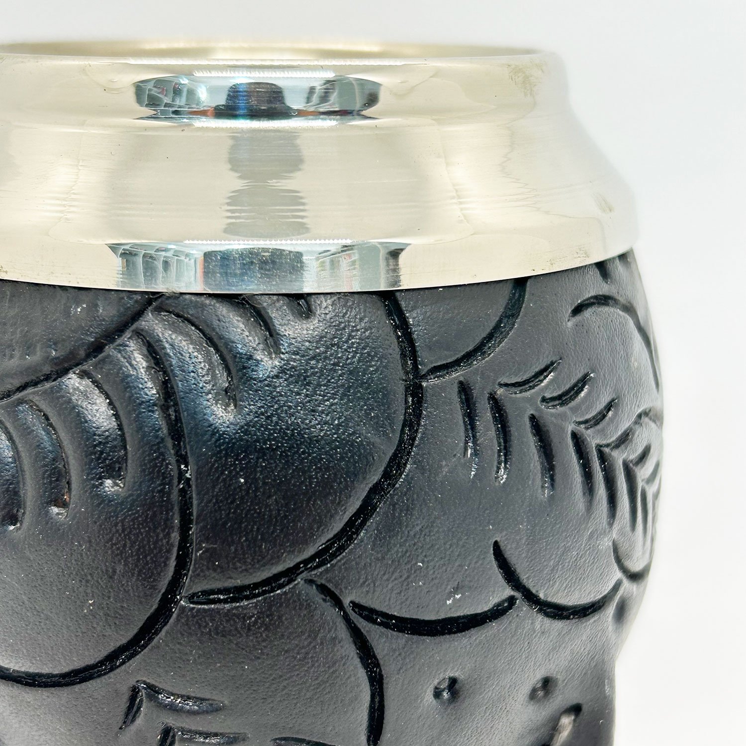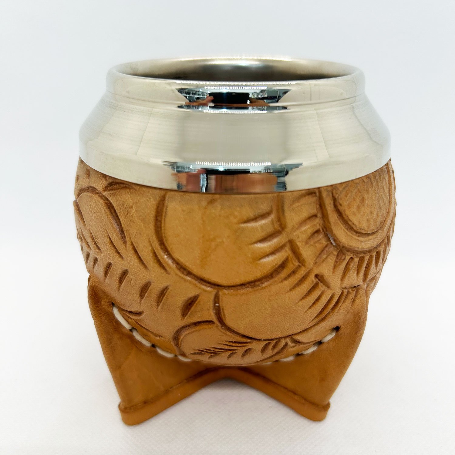Calabaza gruesa, forrado en cuero legítimo labrado, costura cruzada y virola de alpaca.
